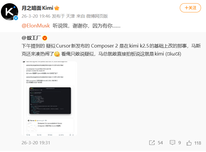 但很快有开发者发现,Composer 2是基于Kimi K2.5微调而来,马斯克也在社交媒体发文表示,“是的,这就是Kimi 2.5。”