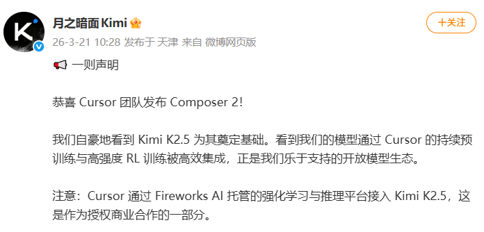 3月21日,月之暗面官方账号在社交平台发文祝贺Composer 2发布,并称“Cursor通过Fireworks AI托管的强化学习与推理平台访问Kimi-k2.5,属于授权商业合作”。