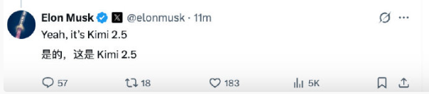 对此,马斯克第一时间在社交平台X转发并评论:“Impressive work from Kimi”(Kimi的作品令人印象深刻),Kimi官方随即以幽默口吻回应:“你的火箭造得也不错!”。