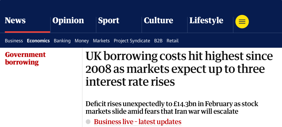 英媒最新报道,截至3月21日,英国10年期国债收益率为5%,达到2008年年中全球金融危机最严重时期以来的最高水平。同时,最新公布的财政数据显示,上月英国的月度赤字为143亿英镑,高于预期,比去年同期增加了22亿英镑。