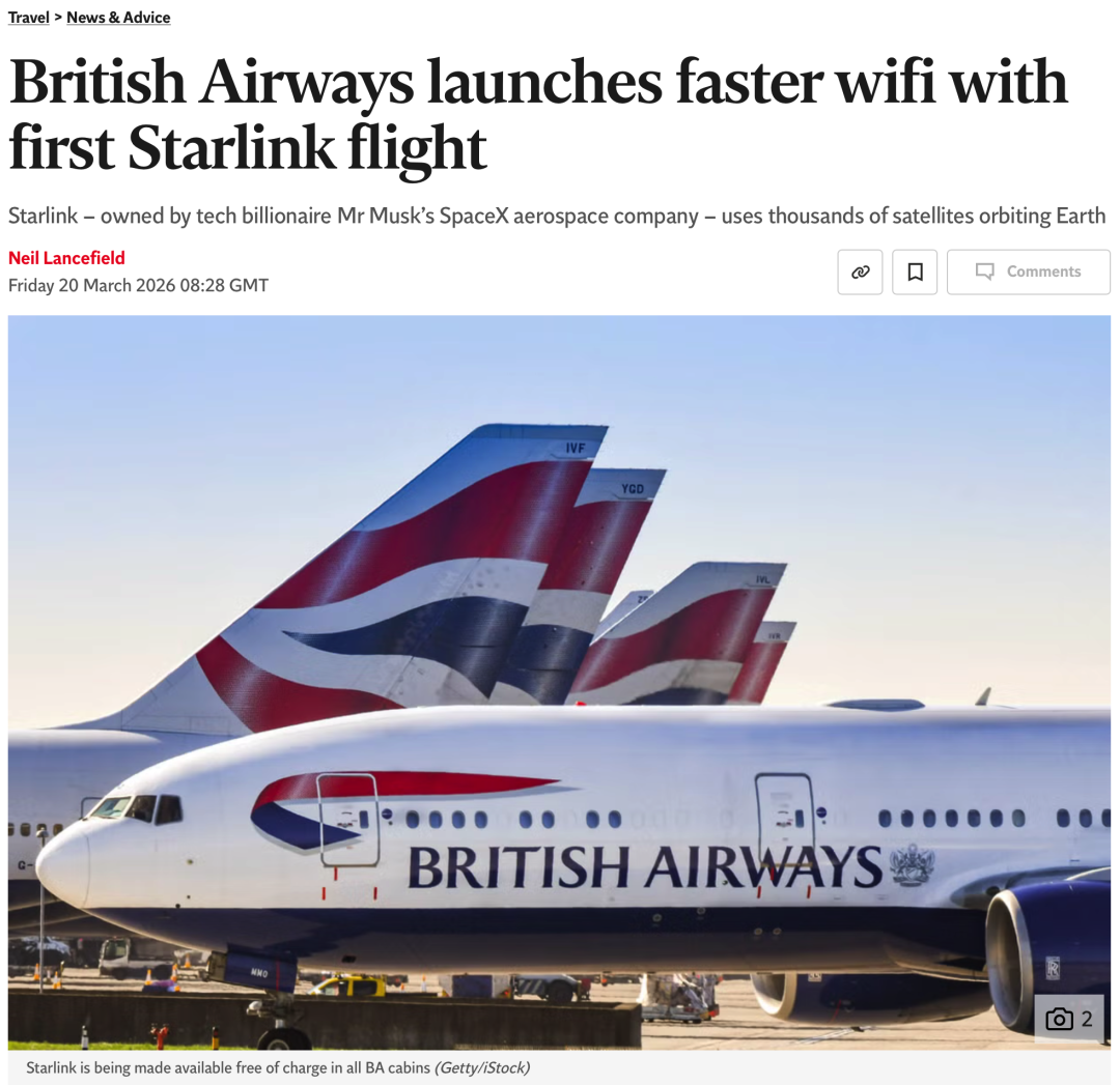 ● 英航正式在航班上推出星链服务,乘客可享受更快Wi-Fi