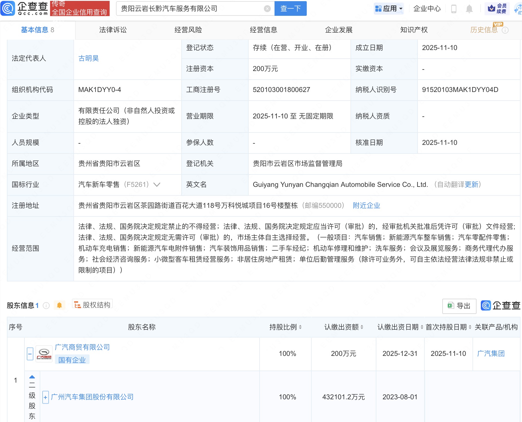 近日,贵阳云岩长黔汽车服务有限公司成立,法定代表人为古明昊,经营范围包括新能源汽车整车销售、汽车零配件零售、机动车充电销售等。企查查股权穿透显示,该公司由广汽集团(601238)间接全资持股。
